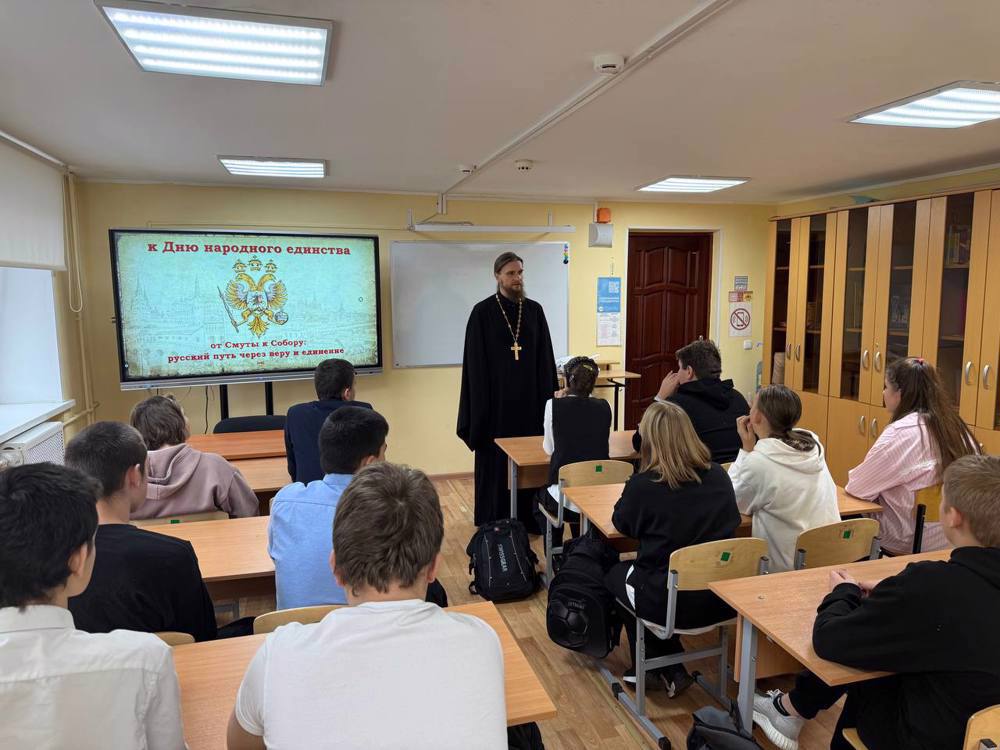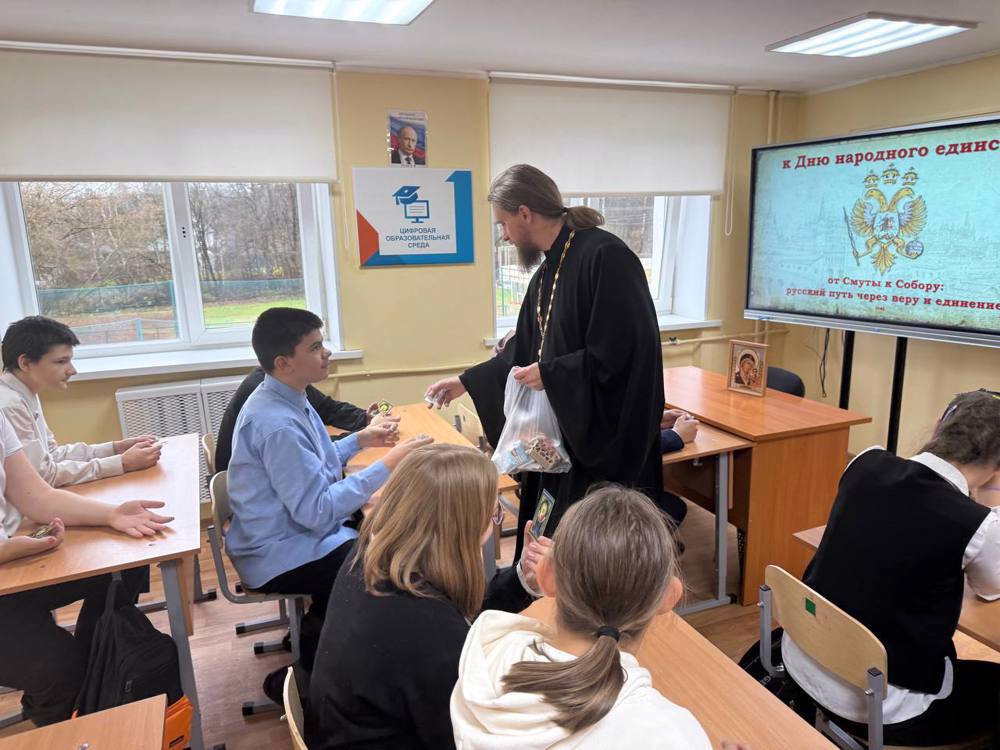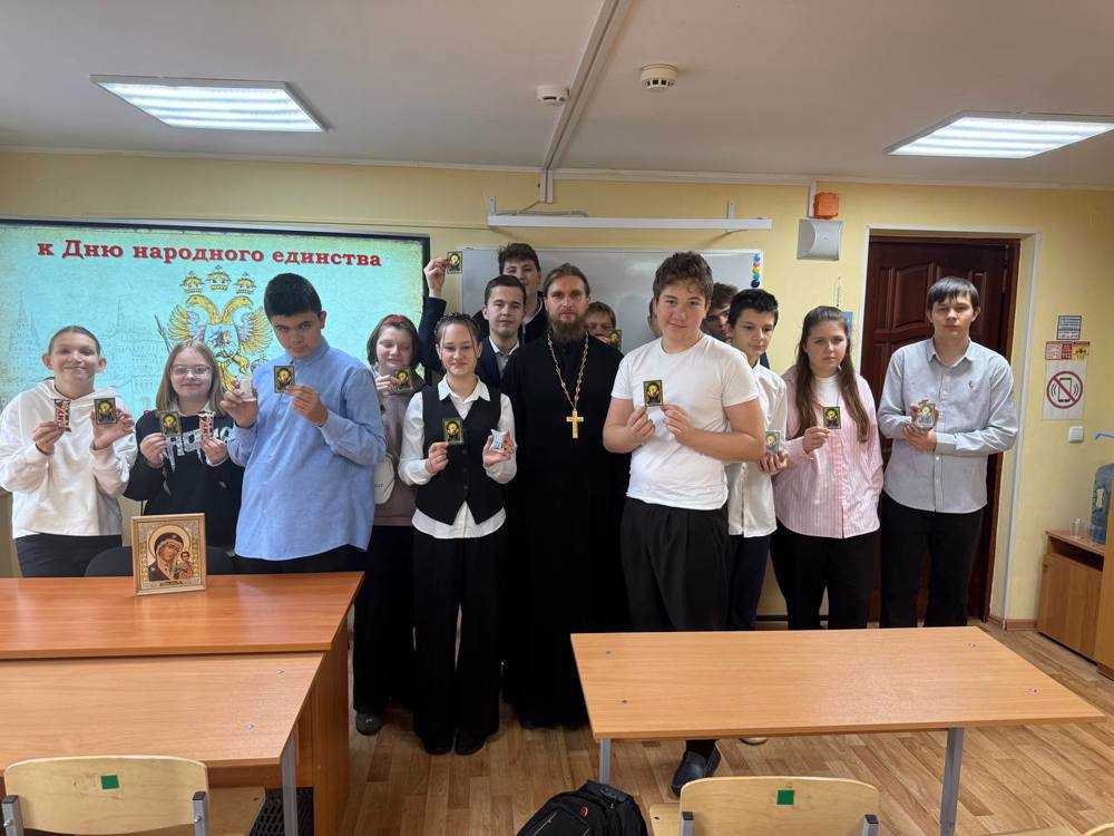 В этот же день отец Алексий посетил Новопетровскую школу-интернат. Батюшка провёл урок у ребят 9 класса. Темой беседы был предстоящий праздник День народного единства и память Казанского образа Пресвятой Богородицы. После урока ребята активно задавали священнику интересующие вопросы о христианской жизни и благочестивом поведении, была затронута тема о хранении языка от сквернословия. В завершении встречи отец Алексий передал ребятам сладкий гостинец.